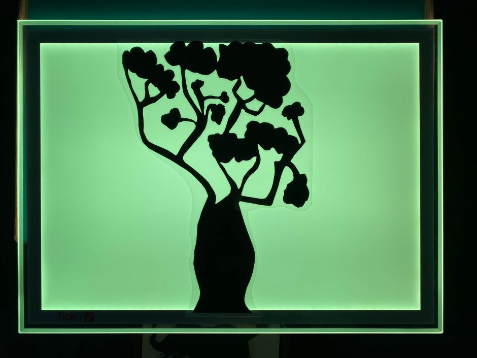 - Siluetas de los animales del cuento en la mesa de luz, bajo el baobab. Hablar de este árbol conocido también como el árbol de la vida y árbol mágico. Muchas tribus africanas se reúnen, conversan libremente, firman tratados o establecen compromisos sentados bajo ese árbol. Lo llaman el árbol de la palabra.